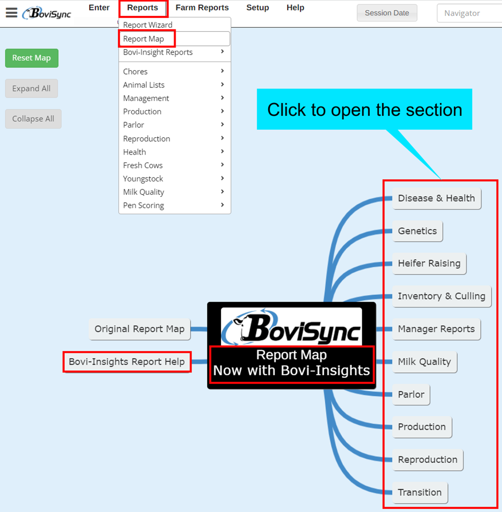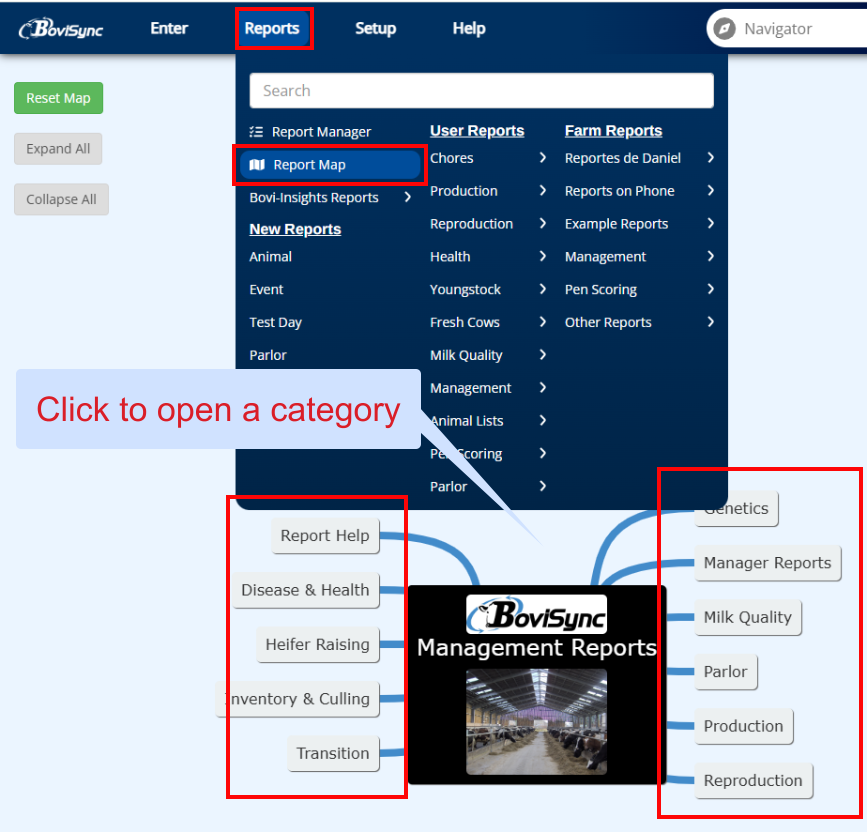 particular management area within your farm. Below are images of where the BoviSync Report Map can be found and what it looks like. Click on a report category, and then continue to click on