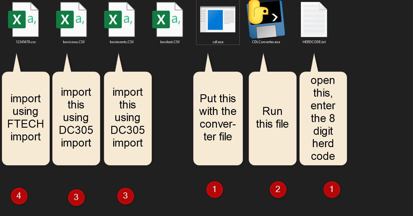 Milk Recording Organizations in the UK can produce a 'CDL' file, that is an executable file (CDL.exe) that contains a herd's data. BoviSync has a file extraction tool that extracts the herd data into importable files from the CDL file, that can be used for either an initial farm data load or for monthly milk test results.