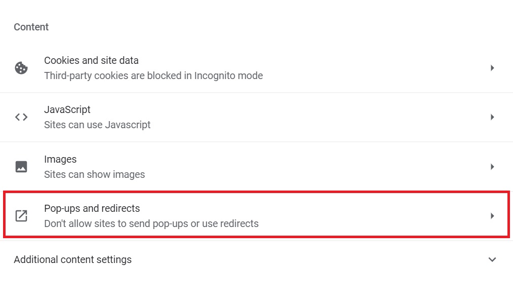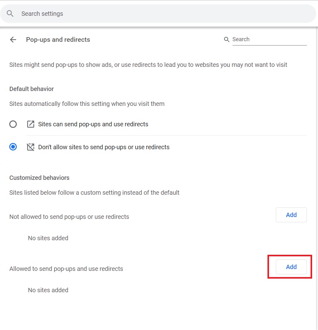 4. Click "Add" under Allowed to Send Pop-ups and redirects