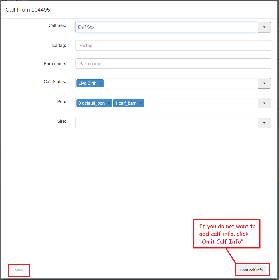 4. You will now be prompted to enter calf information for that Freshening. You can choose 'Omit Calf Info' if you do not want to add a calf.