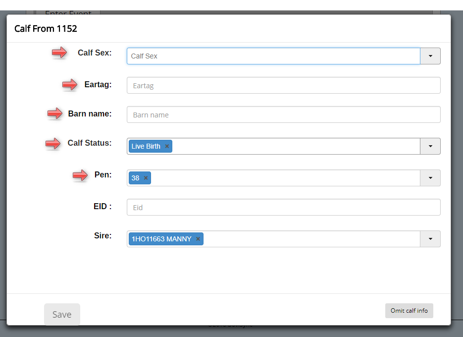 The red arrows (below) represent the required information for a fresh event, the other items are optional. Click Save when finished. The next step will be to enter the calf information.