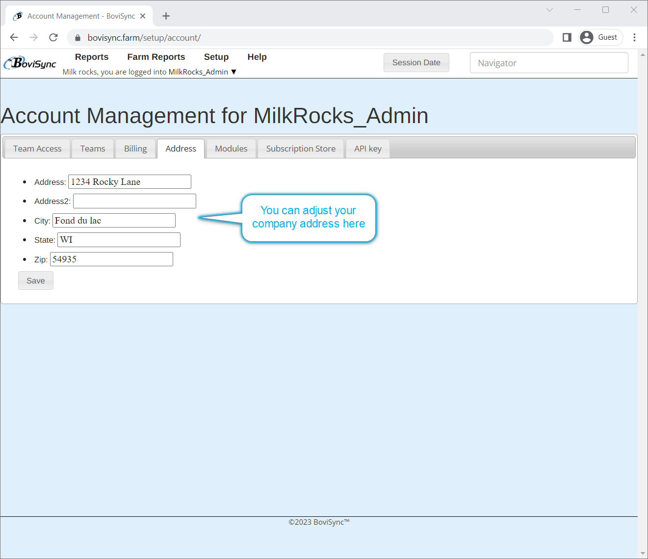 - Click on Setup > Account Management (or go directly to https://bovisync.farm/setup/account/)