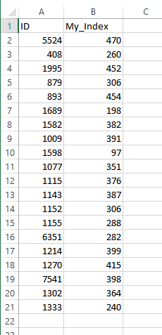 - ID and My_Index need to be the column headers (the column headers have to be spelled and capitalized as shown otherwise the import will not work)