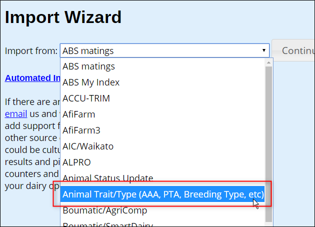 1. Go to Setup > Import and choose "Animal Trait/Type (AAA, PTA, Breeding Type, ect) from the import options. or