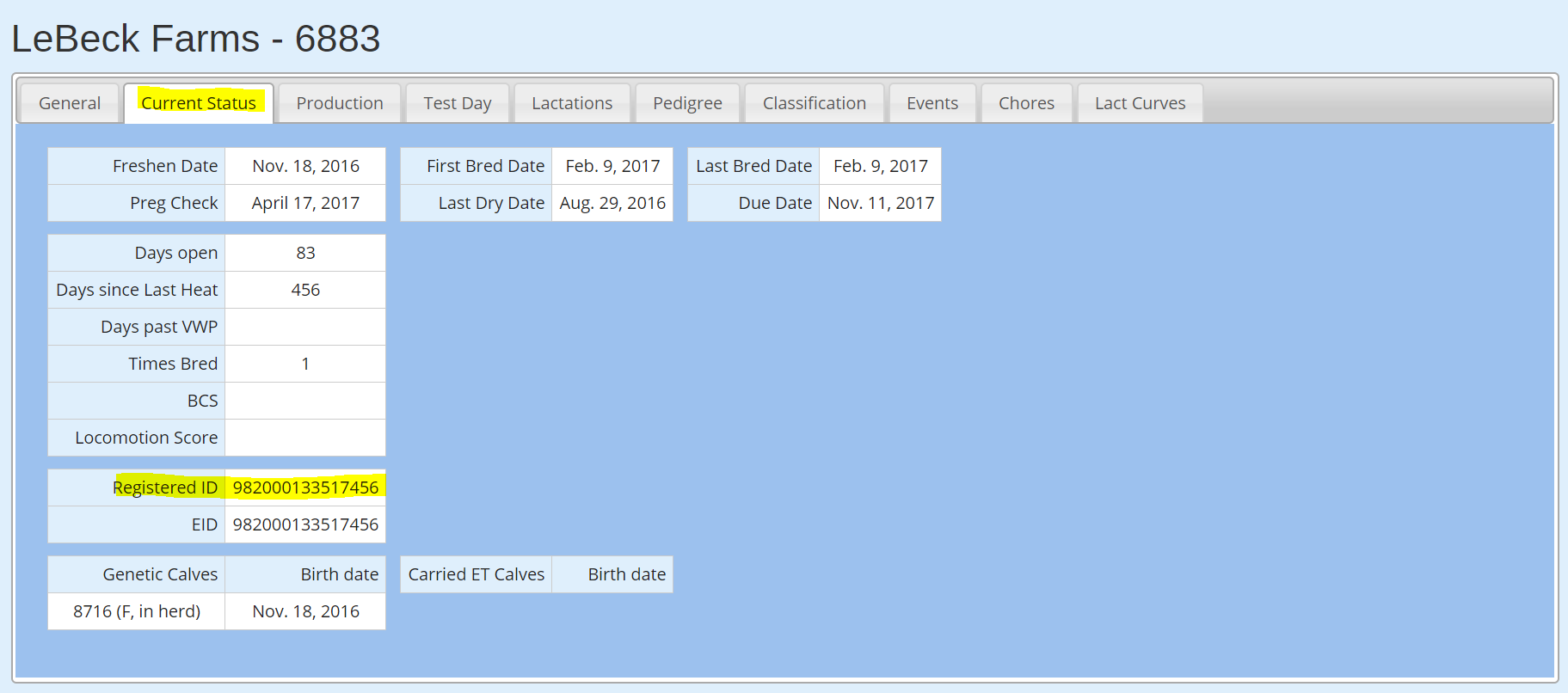 Option 2: Open the animal page and click on the "Current Status" tab: