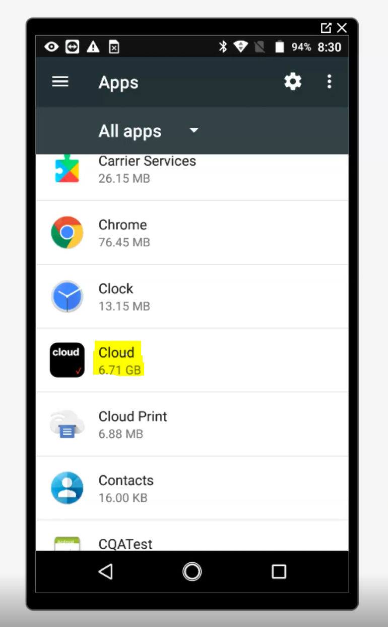 2. On the mobile device, go to "Settings", then look for "Apps" Tap on the app that is using up excessive space, in this example "Cloud" is using a lot of space on the device.