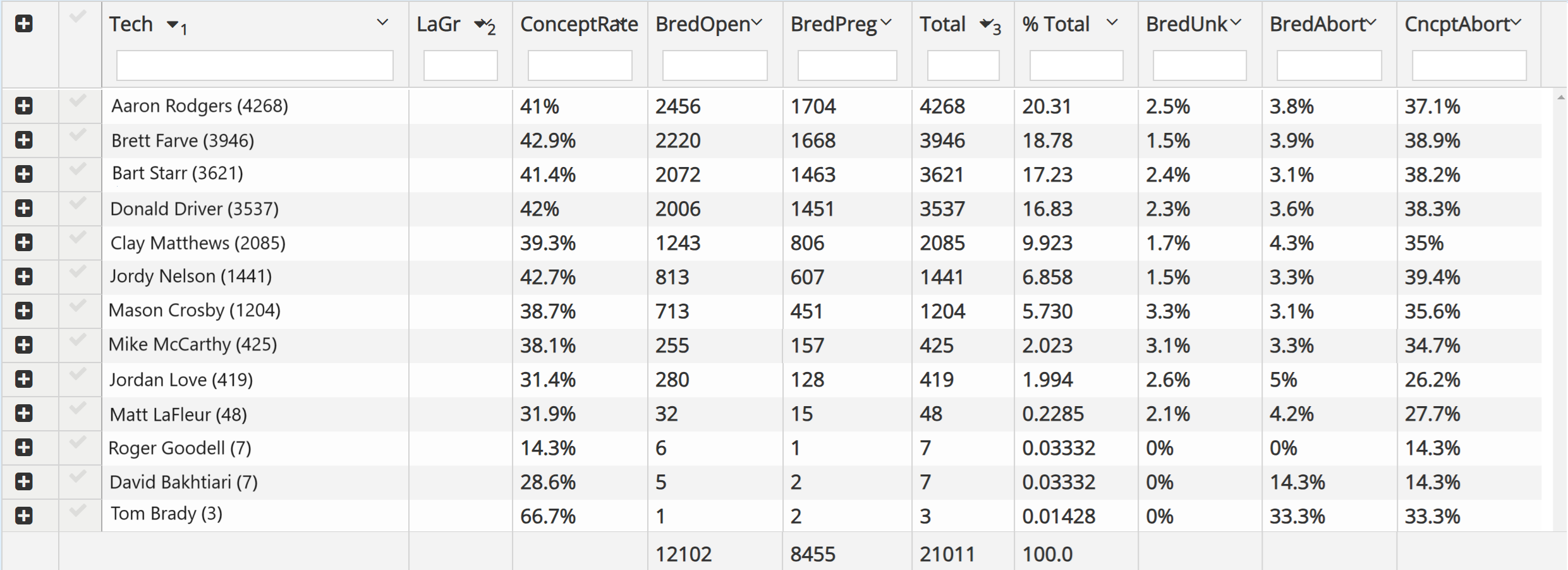 Evaluation by technician over a period of time can be done with conception rate by technician (Conception Rate by Technician Report). Be careful to consider effects of TAI, lact, or other factors that influence who breeds what cows. Technicians breeding in a first lact barn versus a mature barn will clearly have different results for the same technique. To keep an eye on short-term changes, the non-return rate can be useful: Non-Return by Technician (35d PD) Report. Here one can see how many cows have not been re-bred in the 21-35d window. In this report, be careful with small numbers and the influence of what cows are being bred.