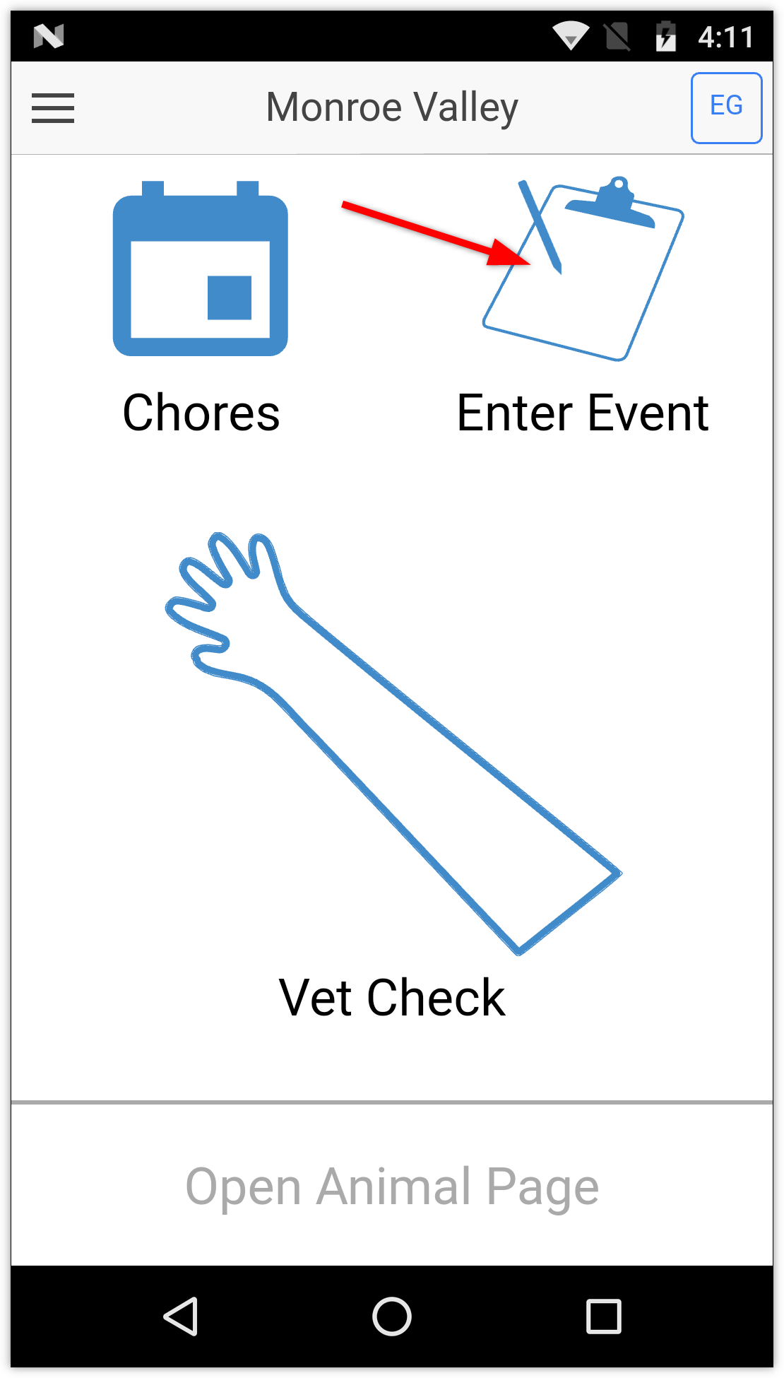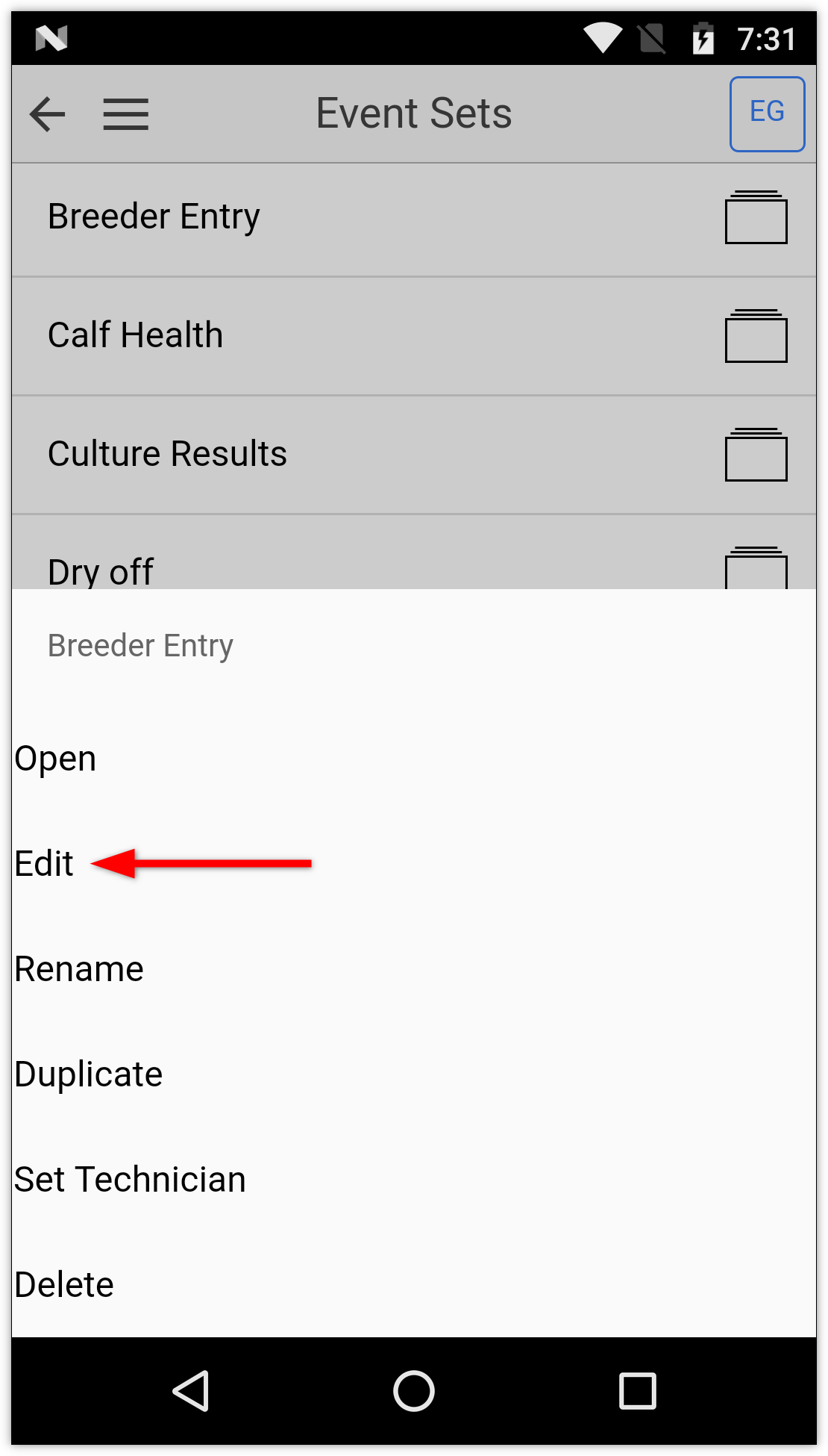 Next, select the individual event or chore within the event set. This is where we will set the app to allow you to choose a technician that you had previously set or to use the user logged into the app. I'll select the Bred event for demonstrating this feature.