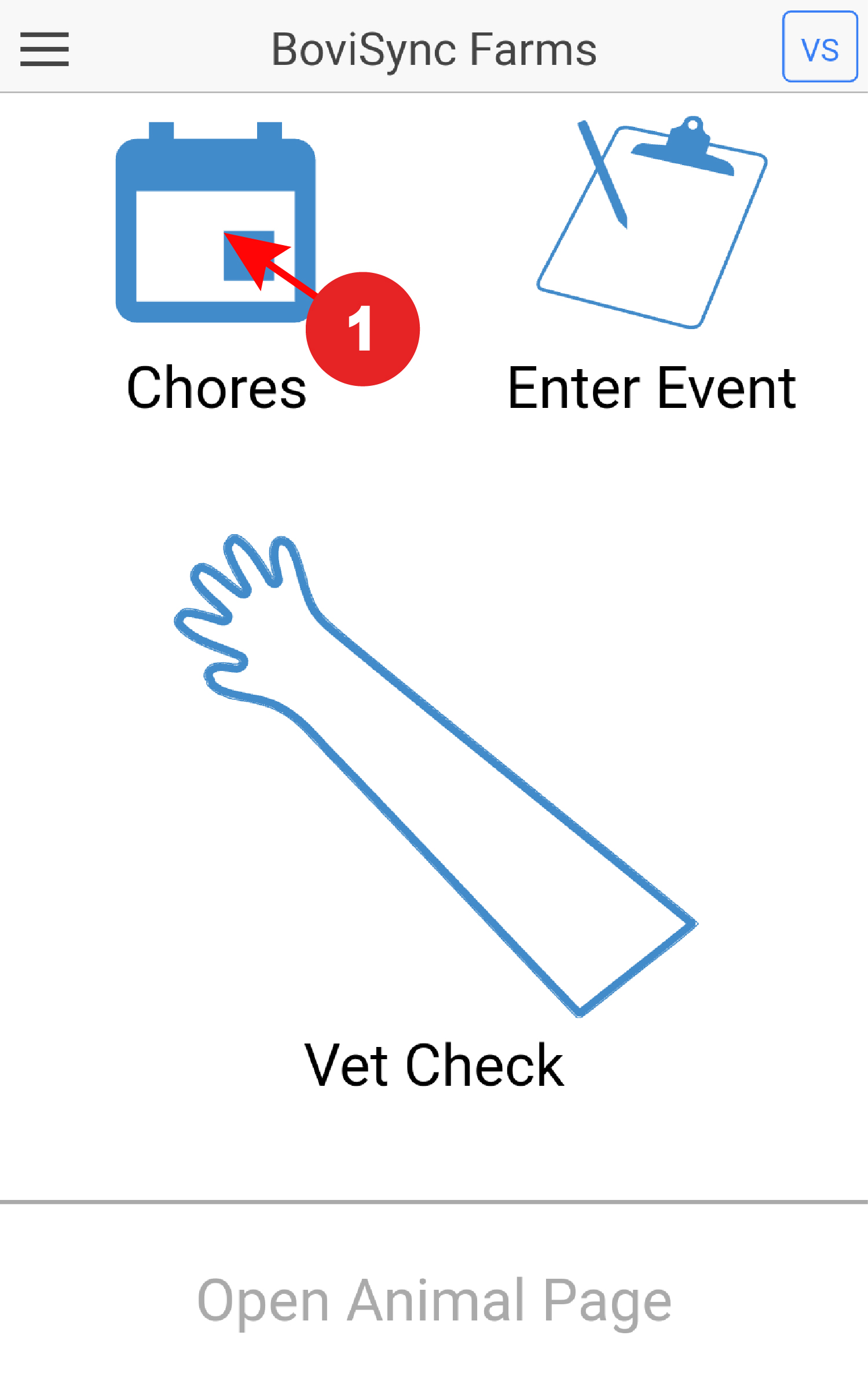 Written instructions: 1. Select 'Chores' from the BoviSync App main screen Figure 1. 2. Select the chore list you want to edit. Figure 2. 3. Tap the Menu button (≡) Figure 3. 4. Select 'Chore Types' Figure 4. 5. Select "Add Chore Type". Figure 5. 6. ...