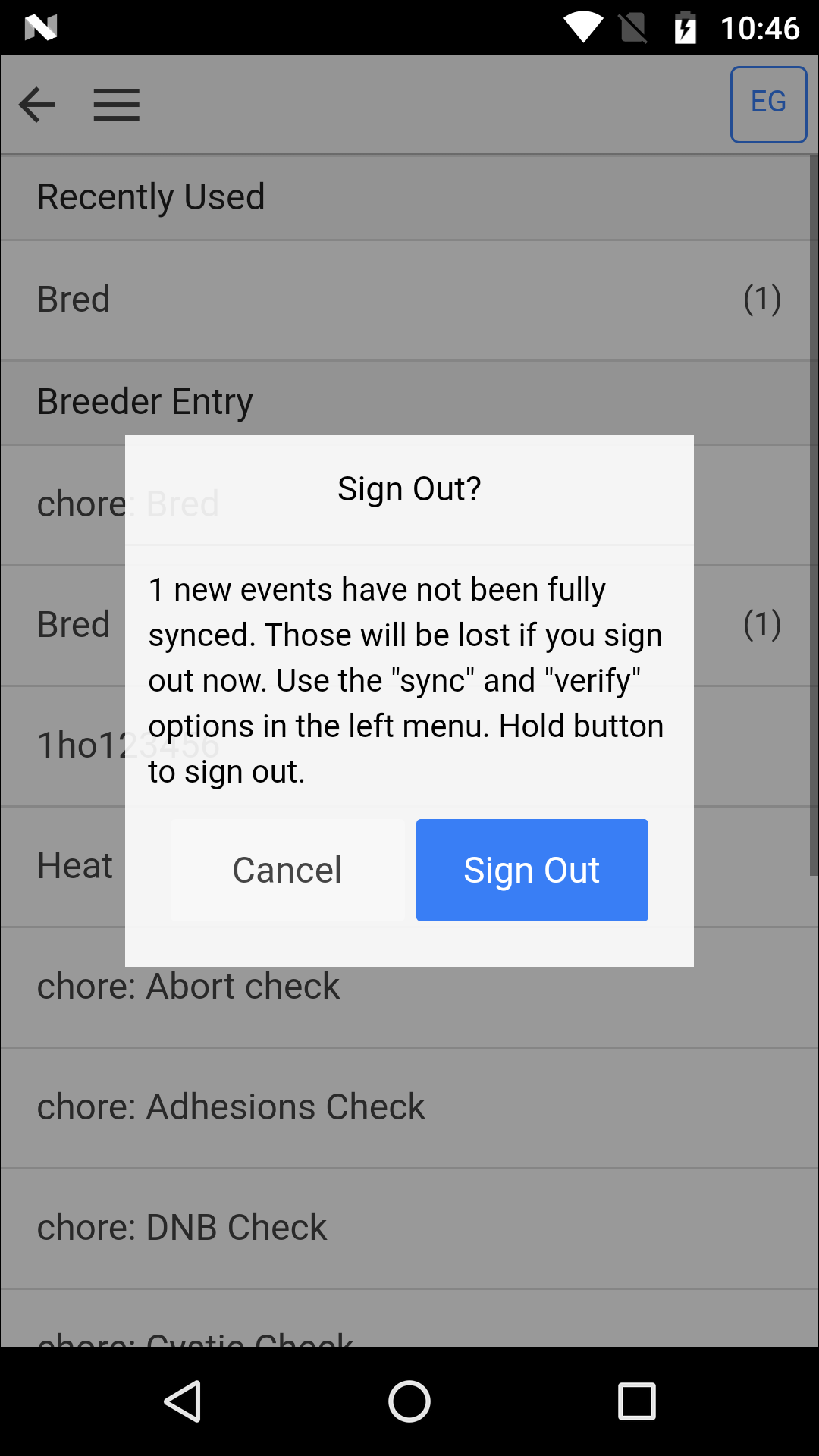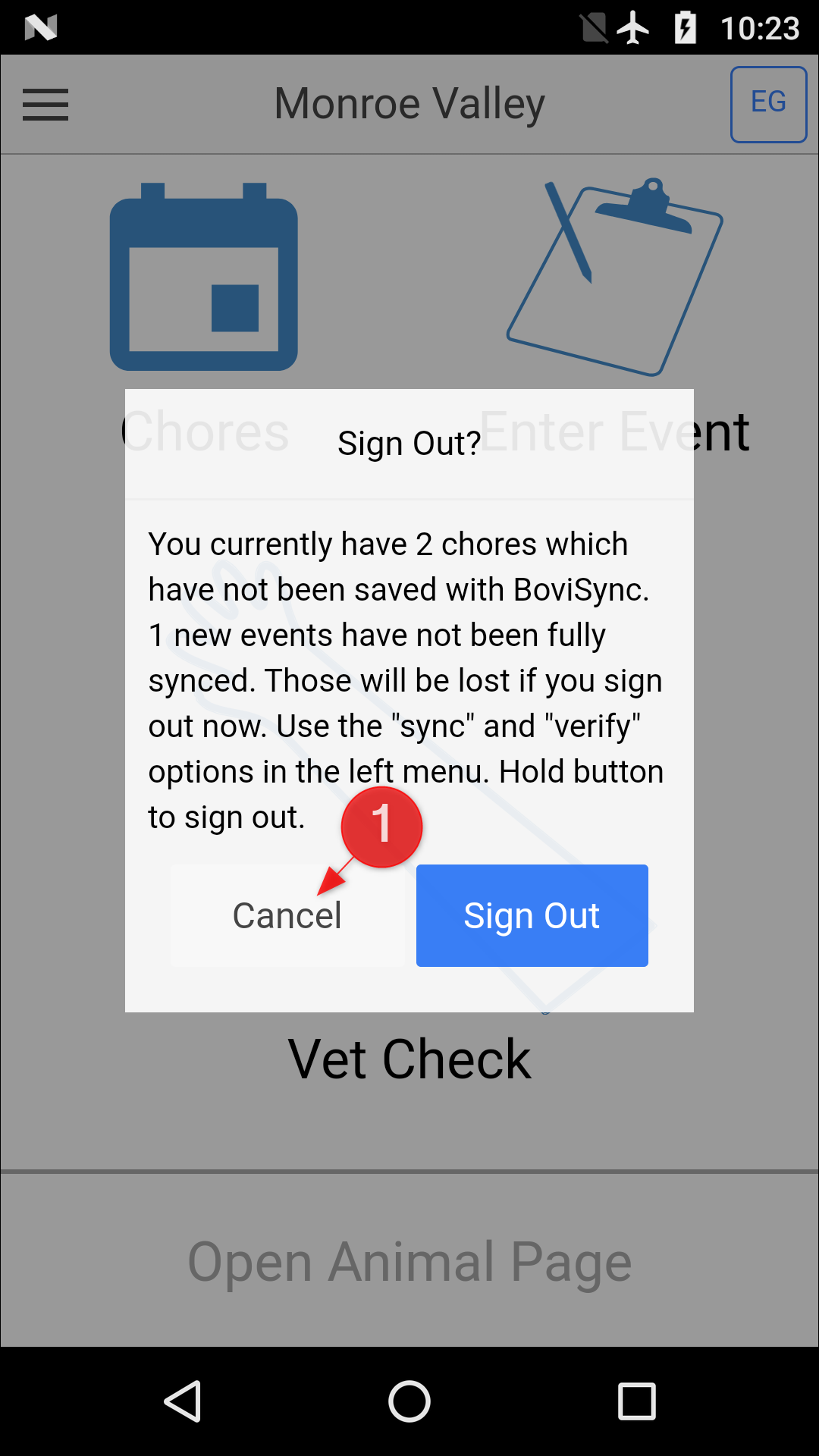 There are certain warnings you might receive if you attempt to sign out of the BoviSync app when you have chores and/or events that have not yet been synced to BoviSync. This guide will discuss warning messages that you will receive and what they mean. To set some basic understanding of how the app works, when you are connected to internet (wifi only) and you complete chores on the phone, they immediately sync in the background to BoviSync. This is only for chores. Events will not automatically sync as chores do.