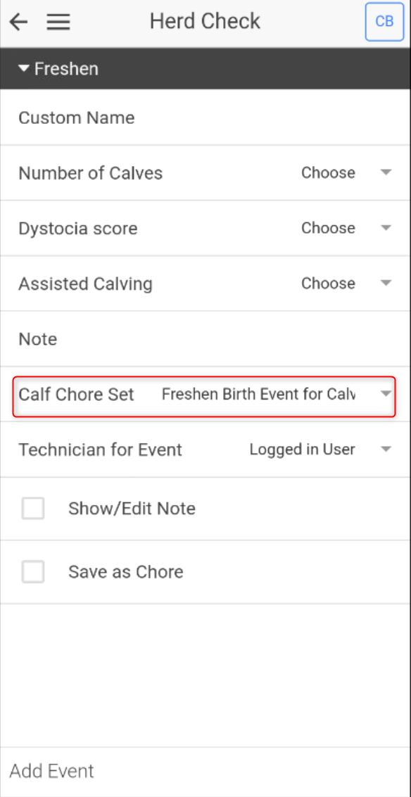 Configure una tarea de parto fresco para terneros (solo si desea registrar el evento para los terneros)